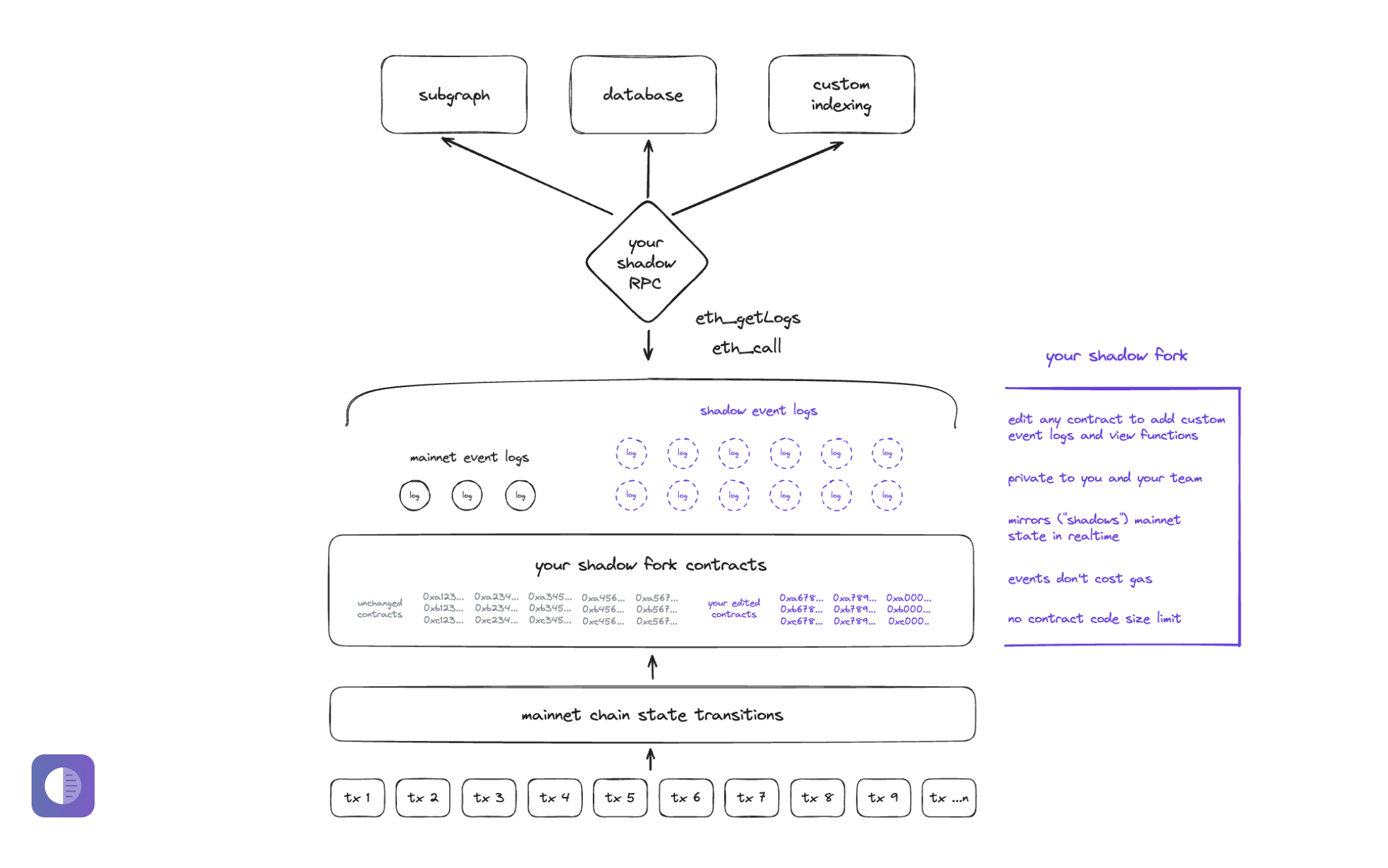 - You can connect your Shadow RPC to subgraph providers and indexing pipelines, or pull data from it into your database.